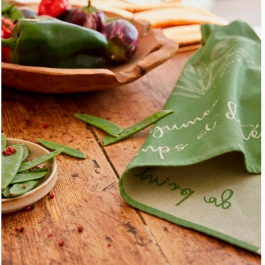 Bring a classic French natural vibe to your kitchen with this lovely French cotton kitchen towel in green and beige, adorned with intricate depictions of spring and summer vegetables such as eggplants, peppers, and artichokes. The balanced green and beige palette adds a seasonal, garden-inspired touch, ideal for those who value quality craftsmanship and a connection to fresh, homegrown produce.