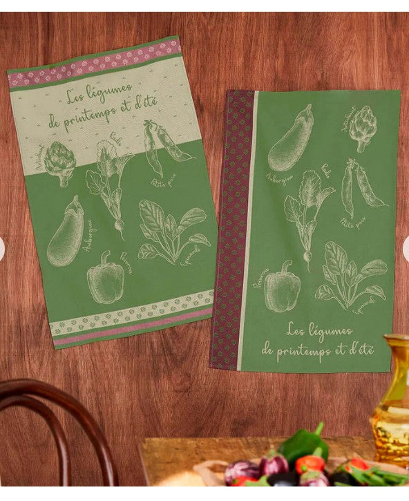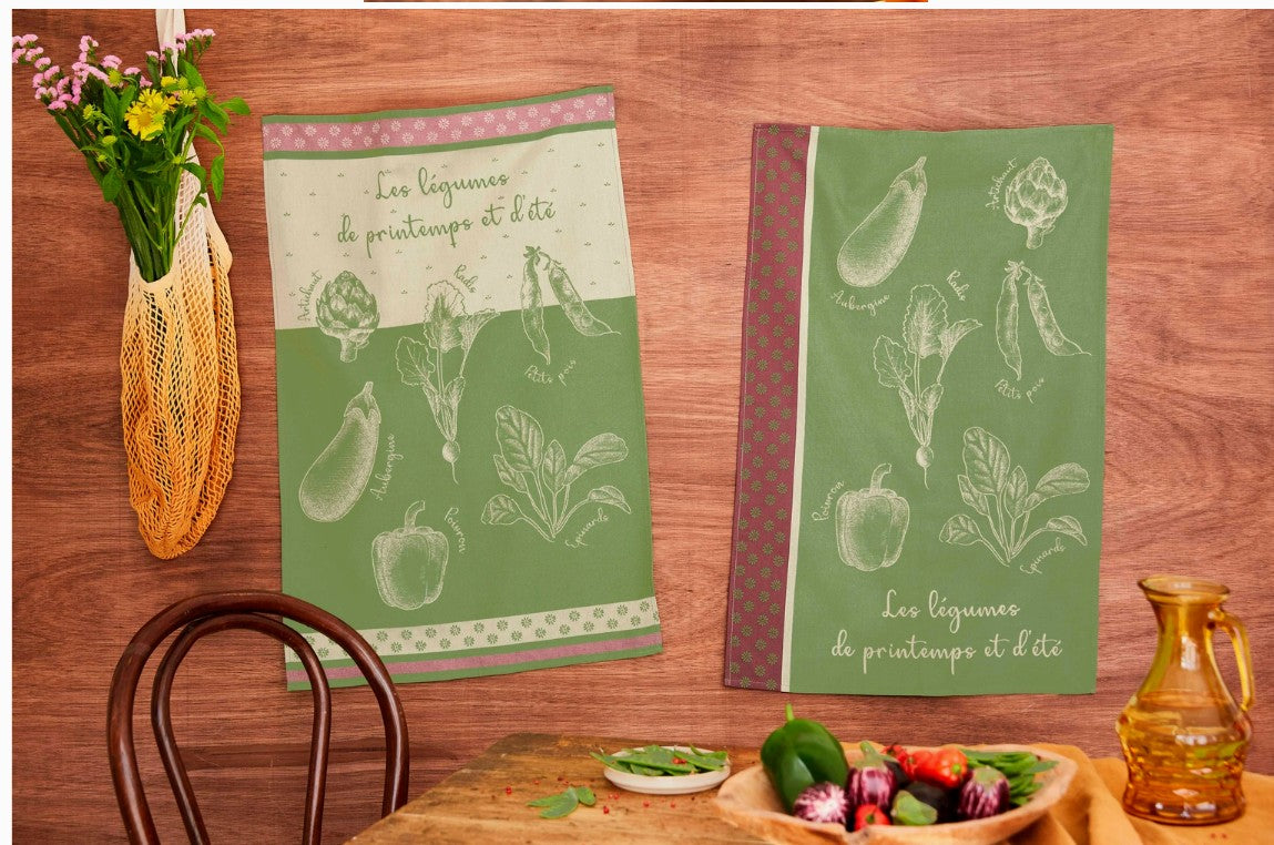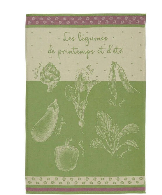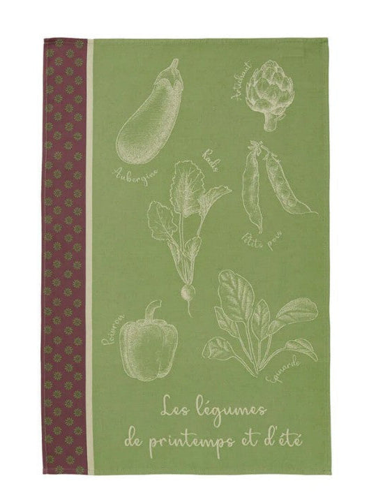 Bring a touch of summer to your kitchen with this elegant French jacquard cotton tea towel, showcasing a vibrant array of summer vegetables such as peas, radishes, and peppers against a bright green background.