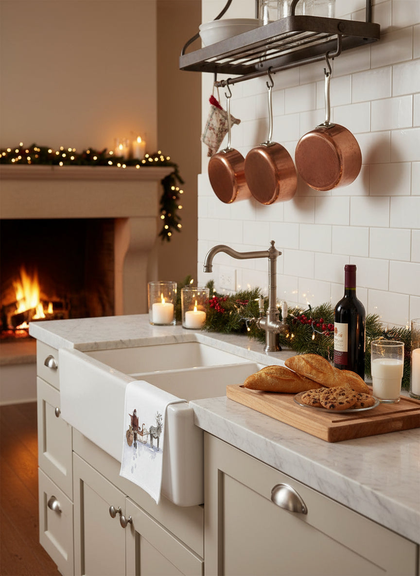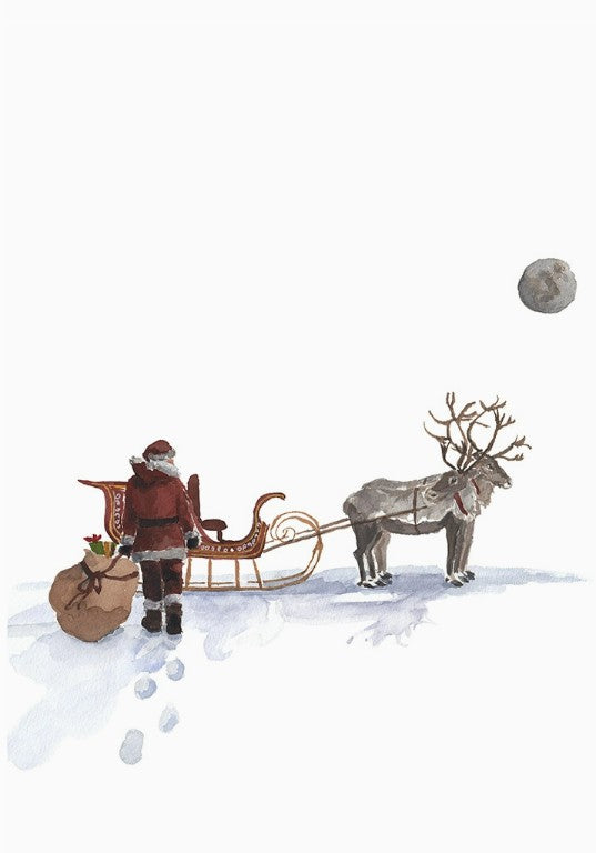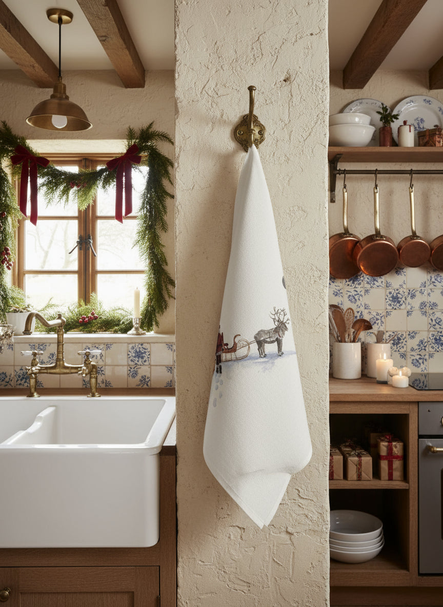 This delightful towel features "Père Noël" - Father Christmas, his sleigh, and reindeer painted in soft watercolors, carrying holiday gifts to fill your kitchen with festive joy. Ideal for setting a cheerful holiday atmosphere, it also makes a thoughtful gift.