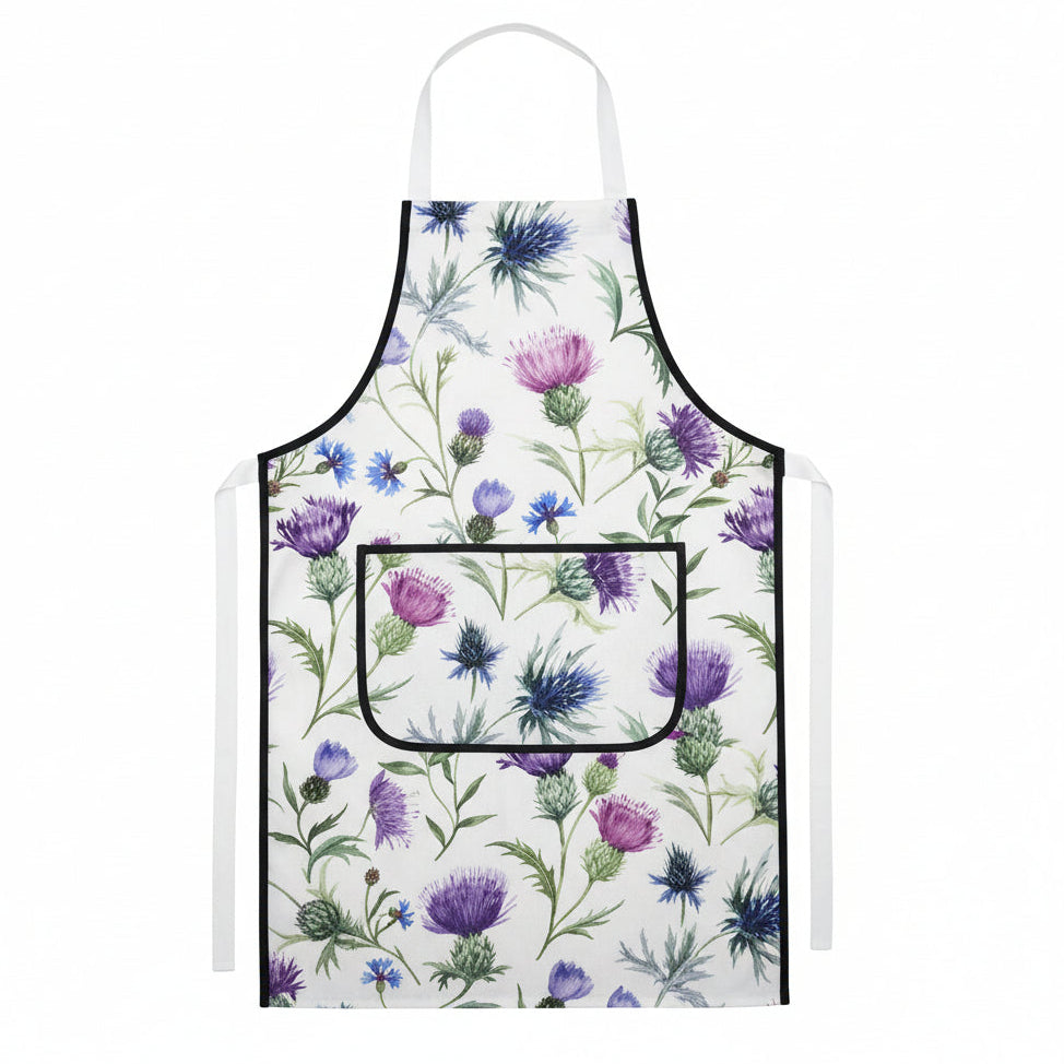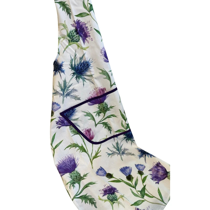 Scotland's national flower and emblem...the thistle!  Your clothes will be protected with this great looking machine washable cotton double pocket adjustable apron.  Beautiful purple and lavender colors.