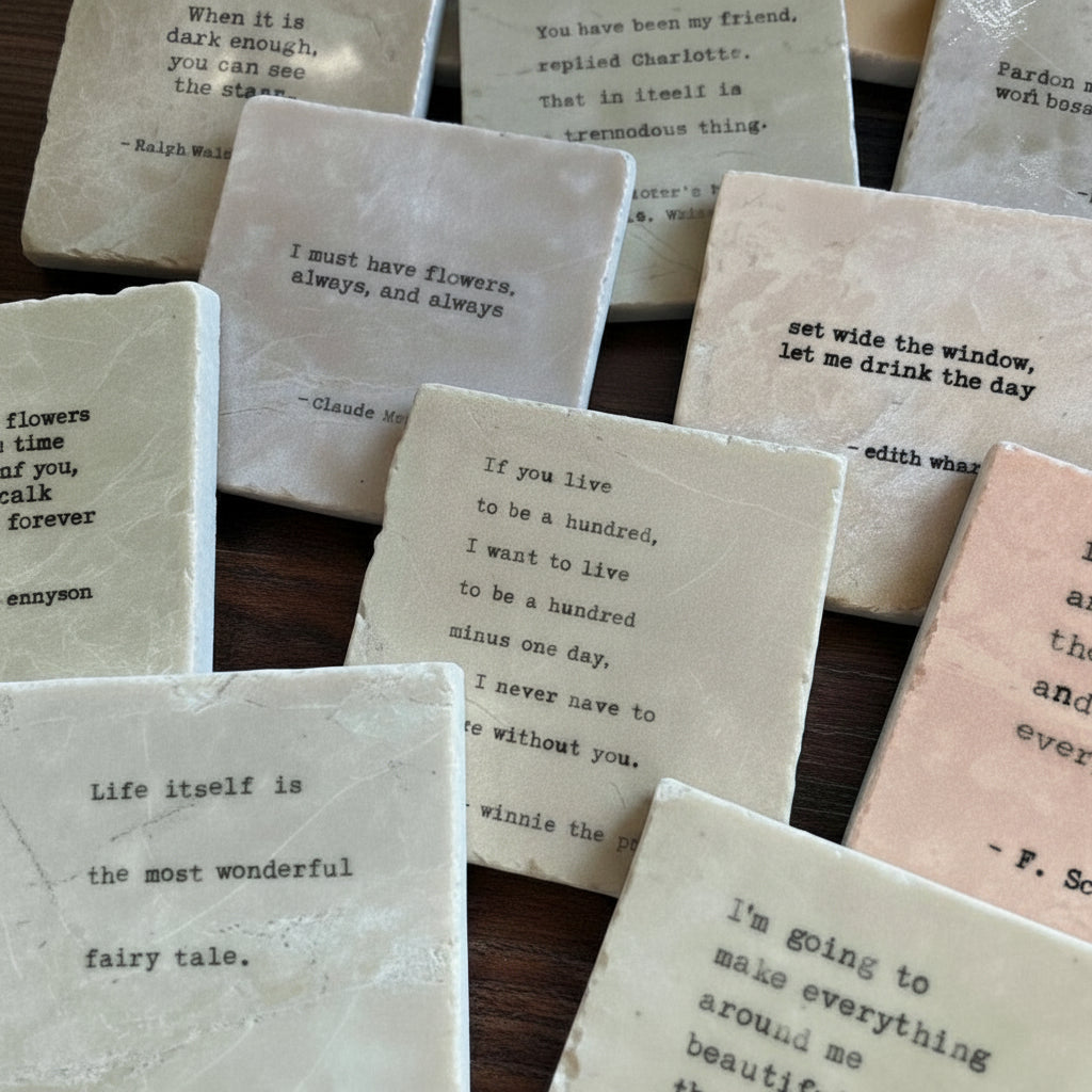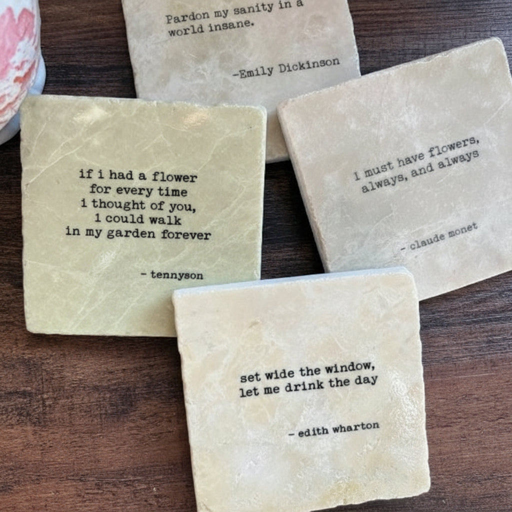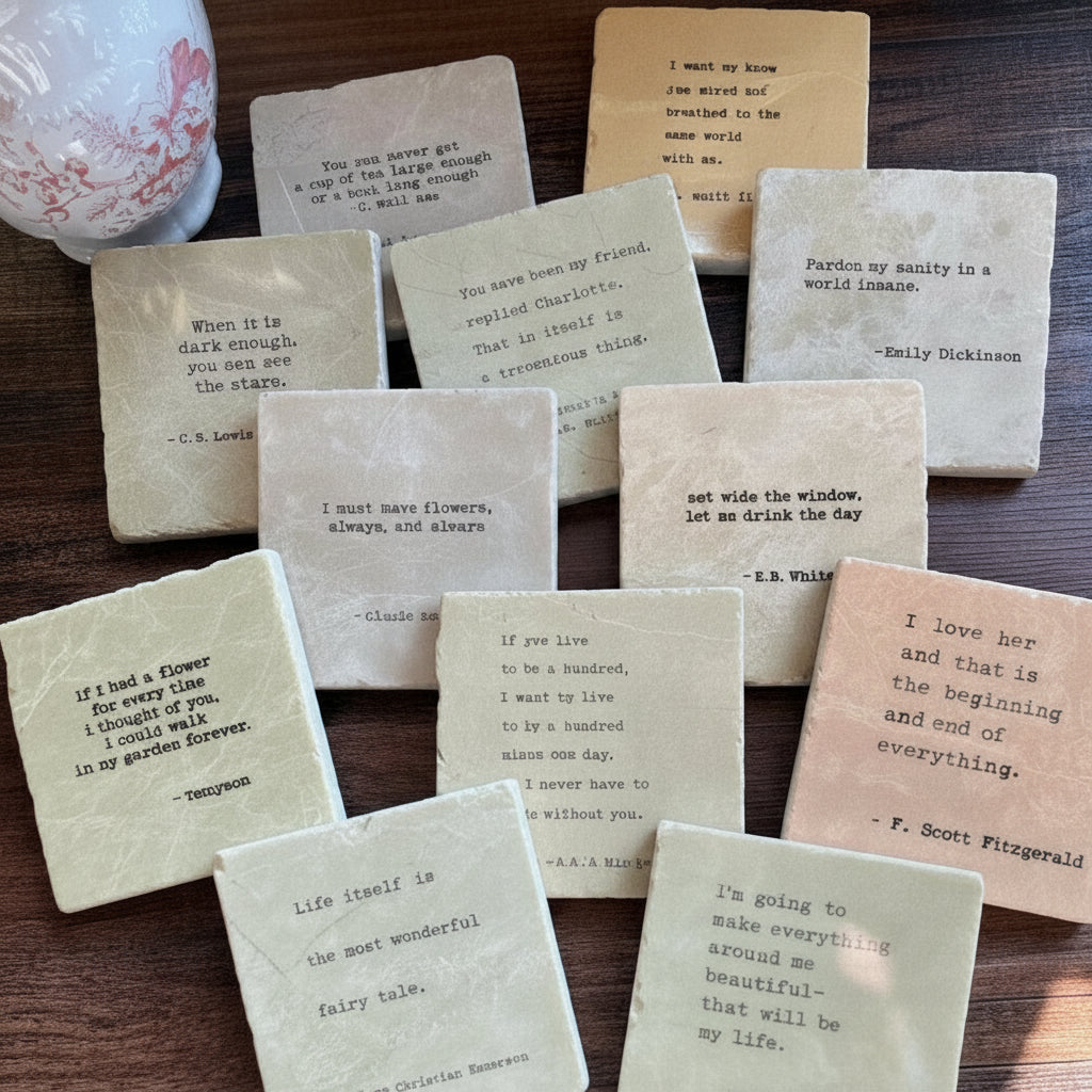 Celebrate literature with this distinctive set of twelve tumbled marble coasters, each featuring inspiring lines and quotes from beloved poets and authors. Handcrafted in the USA, these conversation-starting pieces bring intellectual charm to any gathering space.