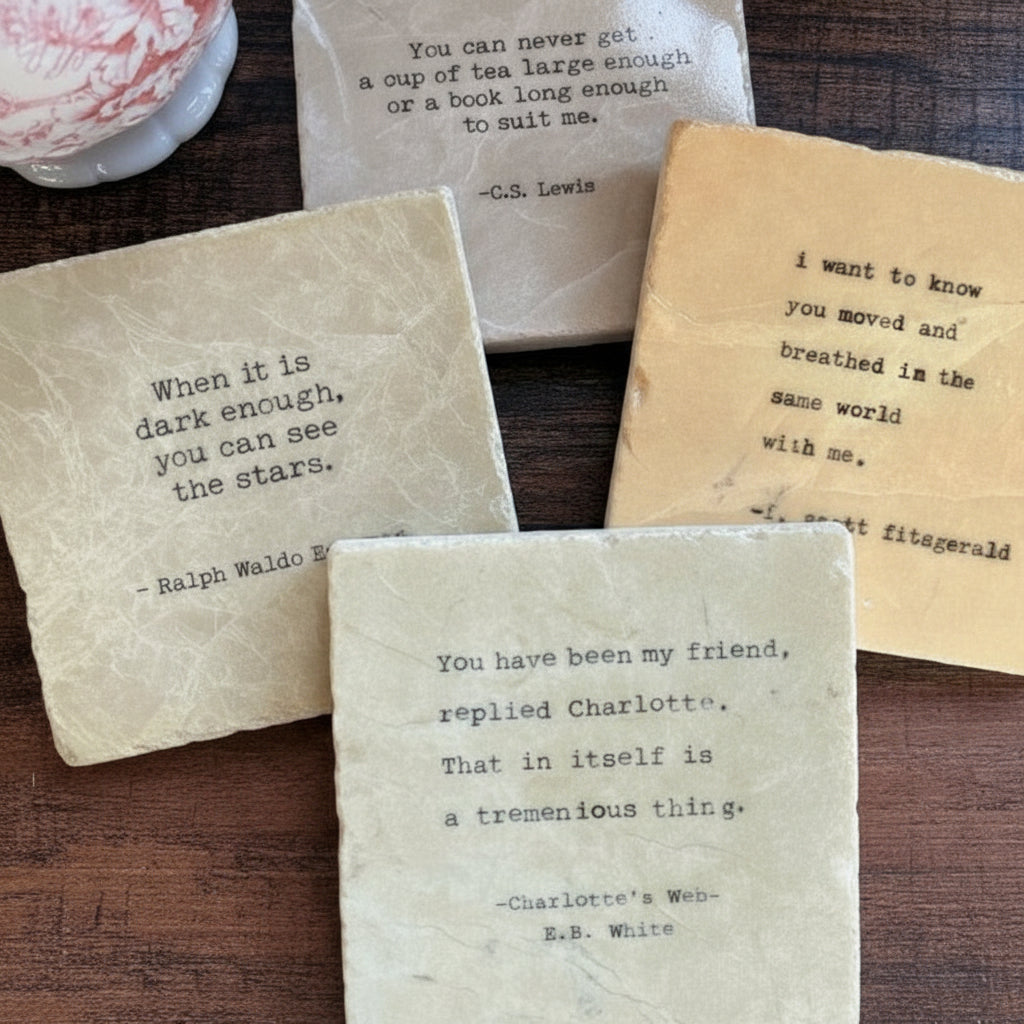 Crafted from durable tumbled marble, they protect surfaces while sparking meaningful discussions about the written word. Transform your table into a curated display of literary appreciation that endures through years of use.